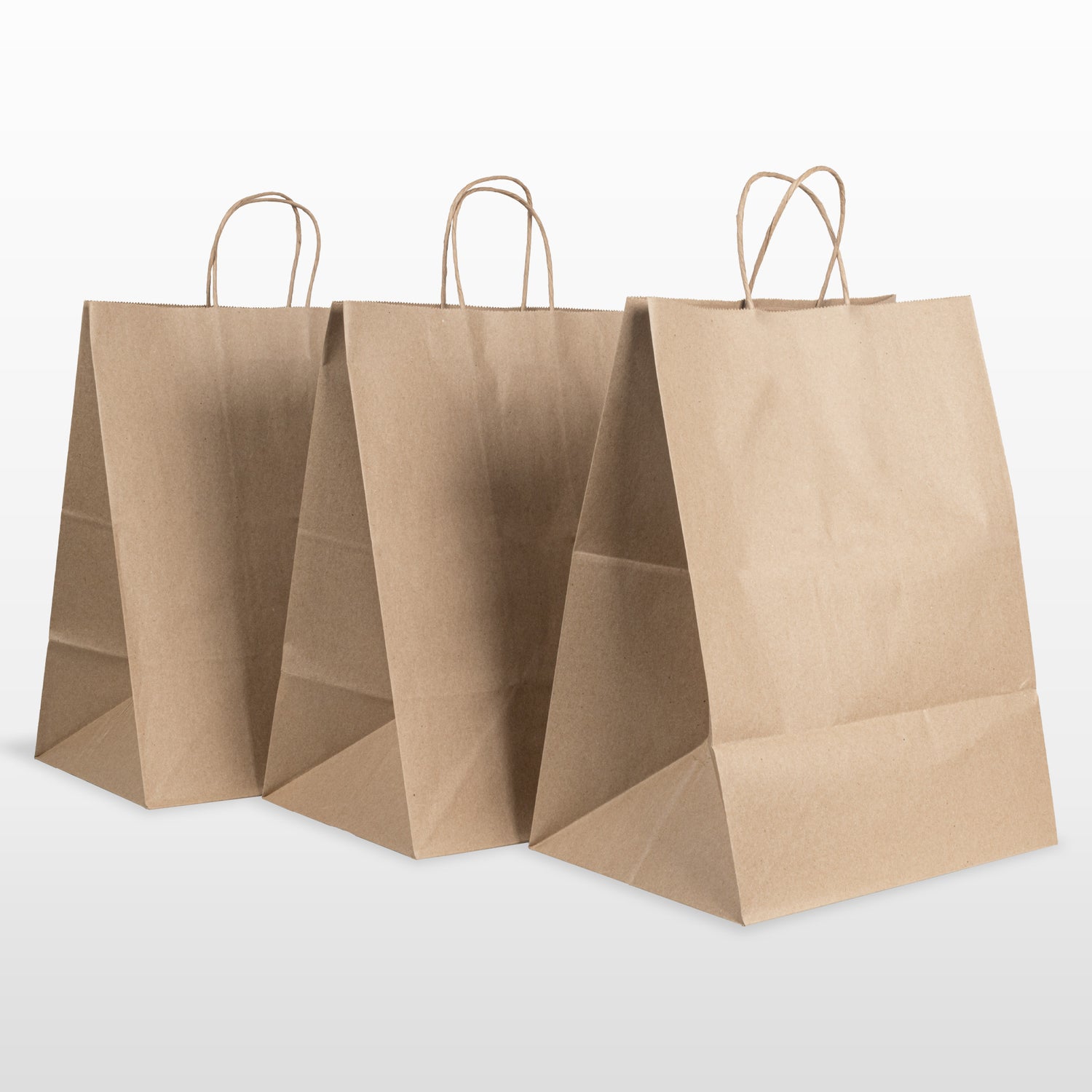 Bolsas de papel con fondo plano y asa que permiten al producto y a la bolsa mantenerse de pie y ser fácil de transportar.